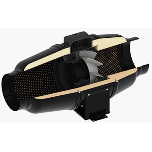 Vỏ ngoài được làm từ thép tráng phủ Polymer, bên trong là lớp kim loại đục lỗ làm hấp thụ sóng ấm khi đi qua, độ dày lớp cách âm là 50mm, Quạt thiết kế côn hai đầu làm tăng tốc độ luồng khí làm tăng áp suất cao hơn so mới quạt thông thường. Cánh quạt thiết kế đặc biết với góc nghiêng định hướng từ đầu quạt cho phép hoạt động đạt hiệu suất cao nhất với độ ồn thấp nhất. các nút cao su phía trên thân quạt nhằm mục đích kín khín không cho độ ồn khuếch tán ra ngoài.